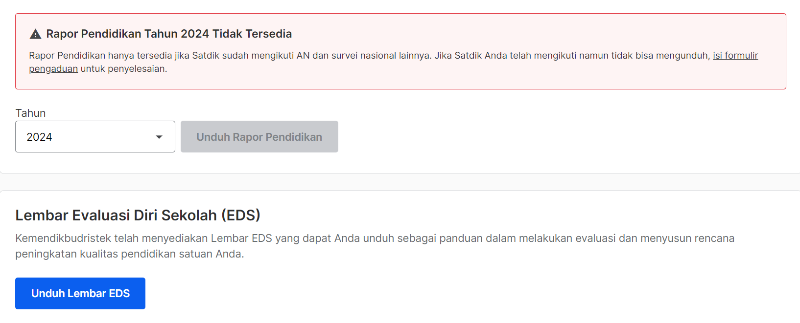 Keterangan: jika muncul notifikasi seperti pada gambar diatas maka rapor pendidikan tidak tersedia pada satuan pendidikan, untuk evaluasi dan menyusun rencana peningkatan kualitas pendidikan bisa menggunakan Lembar EDS yang dapat diunduh dengan menekan tombol warna biru seperti pada contoh gambar diatas.